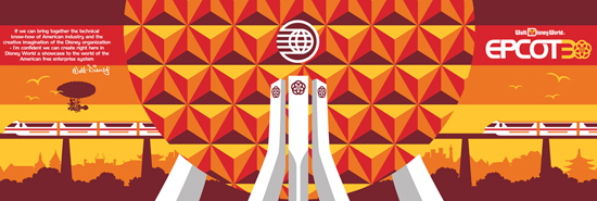 “We loved the warm colors and illustrations found in [the Epcot Center book],” explained Disney Design Group’s John Henselmeier. “In the past five years, we have designed many vintage Epcot items. For the 30th anniversary, we wanted something different – a retro but contemporary feeling, something we call ‘today’s vintage.’ That soft cover book really helped us achieve that look.”