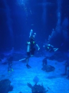After everyone was suited up the moment we were all waiting for was about to happen. We swam to the center of the water and then all of us as a collective group descended into the water. To get a feel of the dive, a Dive Master led the group through the whole tank and then we were allowed to separate and explore. During the entire dive, there was also a videographer to capture the whole experience which was available for purchase at the end of the dive. All proceeds also go to the Conservation Fund.