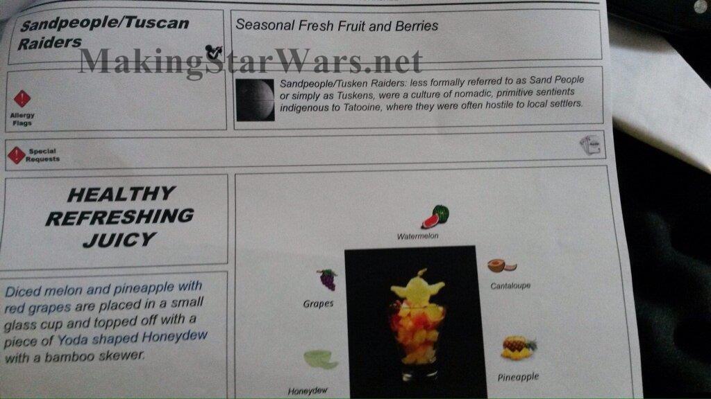 - Sandpeople/Tuscan Raiders: (Healthy Refreshing Juicy )Seasonal Fresh Fruit and Berries – Diced melon with red grapes with Yoda shaped Honeydew