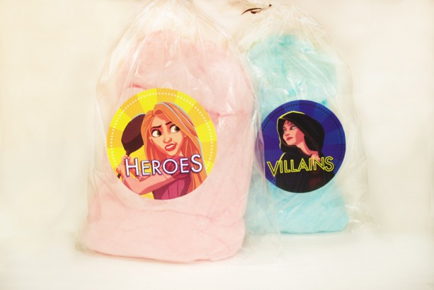 - Pink and blue cotton candy, themed to “Heroes and Villains.”