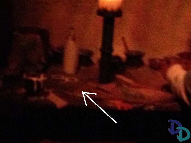~ On your right, you’ll pass by monks” toiling endlessly” and one of them is sleeping. As you pass him, look back and on the top right corner of his scroll is an inkblot that is in the shape of Mickey’s head. Click link for Hidden Mickey image